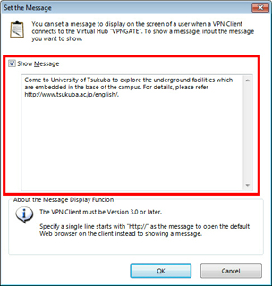 You can show your message to users who connect to your VPN Server. To set up the message, open the property of the "VPNGATE" virtual hub, and specify the message.